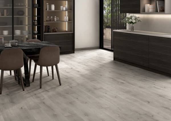 פרקט Finfloor דגם Calcic מציע גוון אלון בהיר עם נגיעות אפורות עדינות, המעניק לחלל מראה מודרני, נקי ומרווח.